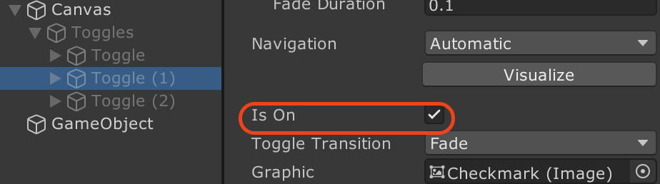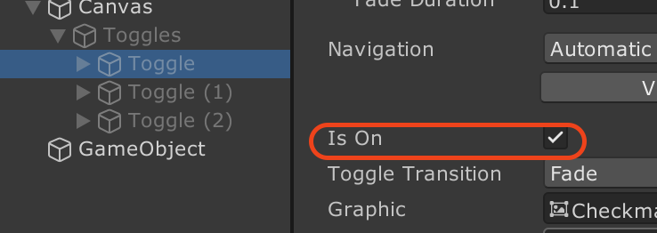 아까 말했듯이 둘다 체크된 상태에서 토글 그룹이 달린 부모 오브젝트가 활성화되면 IsOn이 체크된 토글 중 하이라키 상에서 가장 하단의 토글의 IsOn이 활성화가 된다.