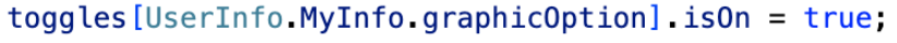 일단은 Medium의 토글이 IsOn으로 남아있지만 위의 코드와 같이 UserInfo에 기존 그래픽 옵션에 대해 따로 저장을 하고 있기 때문에 위와 같은 코드를 작성하면 기존 옵션인 High의 index를 true로 바꿀 것이다.