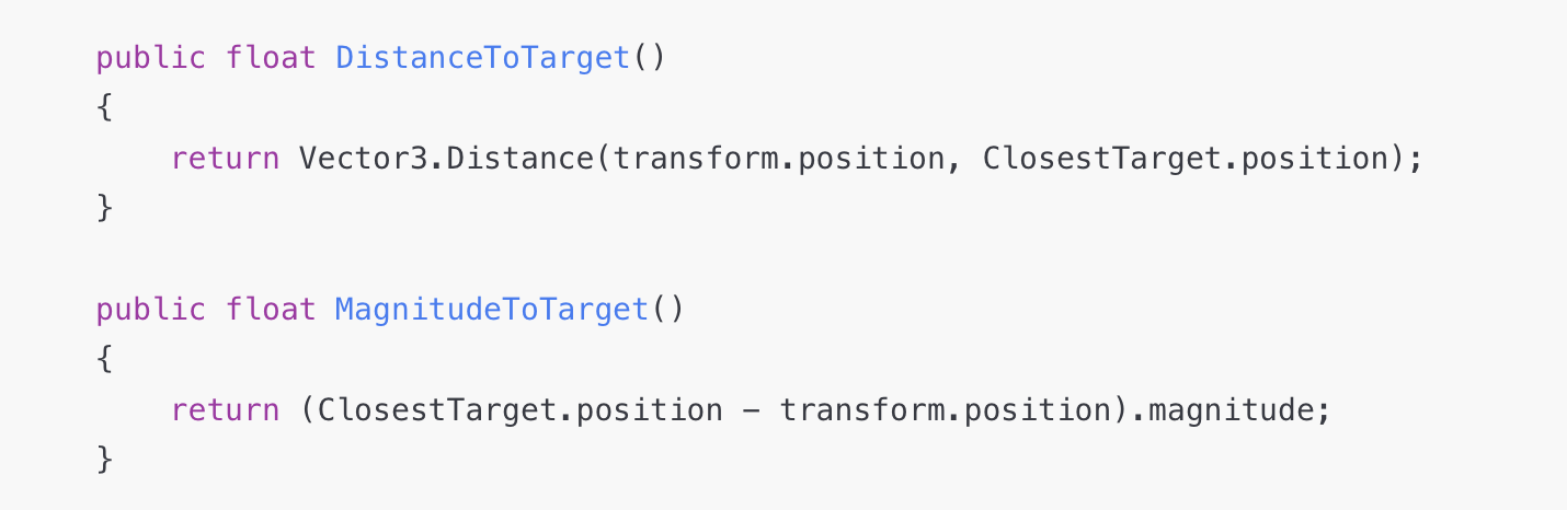 magnitude는 하나의 벡터에 대한 크기를 구하는 반면 distance는 거리라는 이름에 걸맞게 두 좌표(벡터)를 잇는 벡터의 크기를 구하는 것이다.