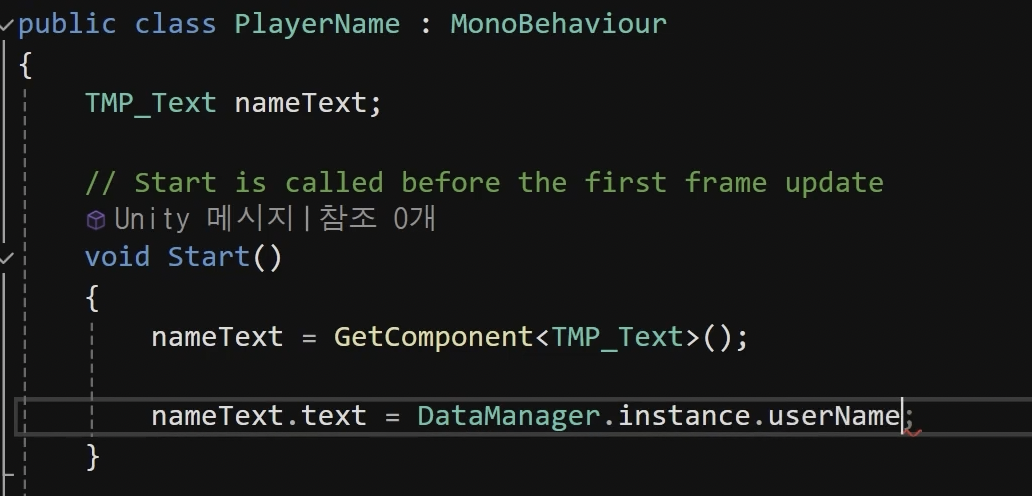 이제 게임씬에서 이 싱글톤으로 만들어 넣어준 데이터를 활용해주면 되는 것이다. 이를 위해 PlayerName 클래스를 하나 만들었고