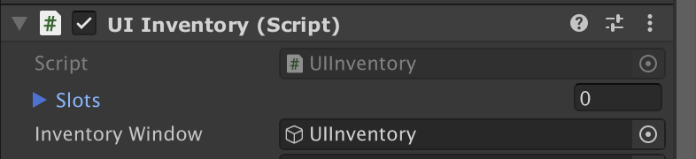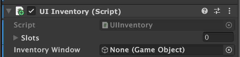 UIInventory 스크립트의 inventoryWindow 변수에 값이 할당되지 않았다고 한다. 고로 인스팩터 창에서 할당해주라는 메세지이다.