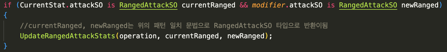 이렇게 되면 만일 RangedAttackSO가 맞다면 CurrentStat.attackSO를 RangedAttackSO 타입의 currentRanged로 내보내 if문 안에서 CurrentStat.attackSO 대신 currentRanged로 사용이 가능하다.