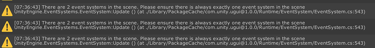 유니티 - 2 event systems 에러 보통 씬을 LoadScene 했을 때 additive로 불러왔을 때 맞이할 수 있는 에러이다. 말그대로 event system이 2개가 있다는 의미로 씬1과 씬2(additive할 씬)이 있다면 캔버스를 만들때 자동으로 생기는 event system이 씬1에도additive를 할 씬2에도 존재한다면 2개의 event system이 존재하게 된다. 고로 위와 같이 2 event systems 에러가 나는 것이다. 둘 중 한쪽의 event system을 제거해주면 된다. 유니티 2024.08.19